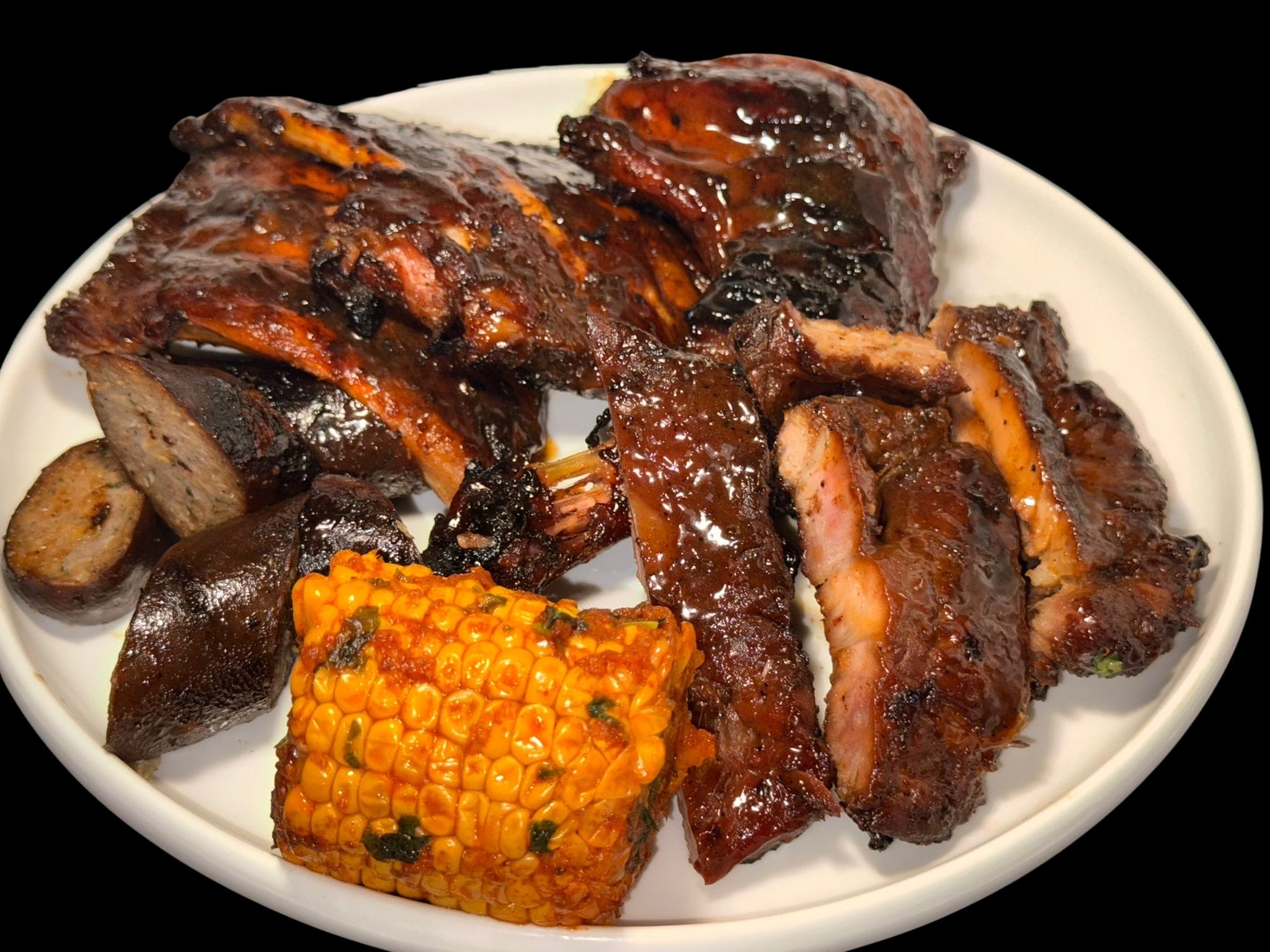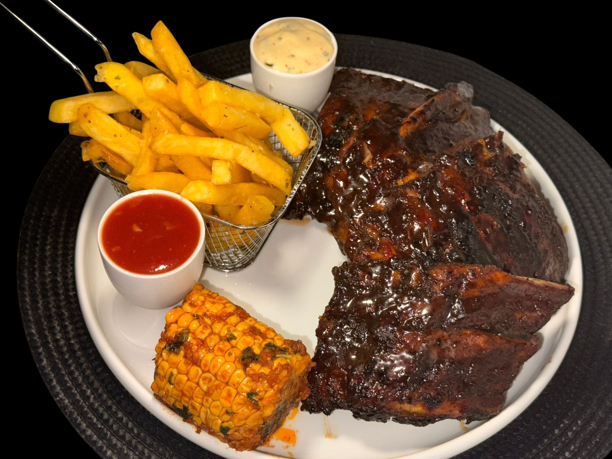 BBQ Ribs: met koolsalade, halve maïskolf, knoflookbrood, bijgerecht en drank