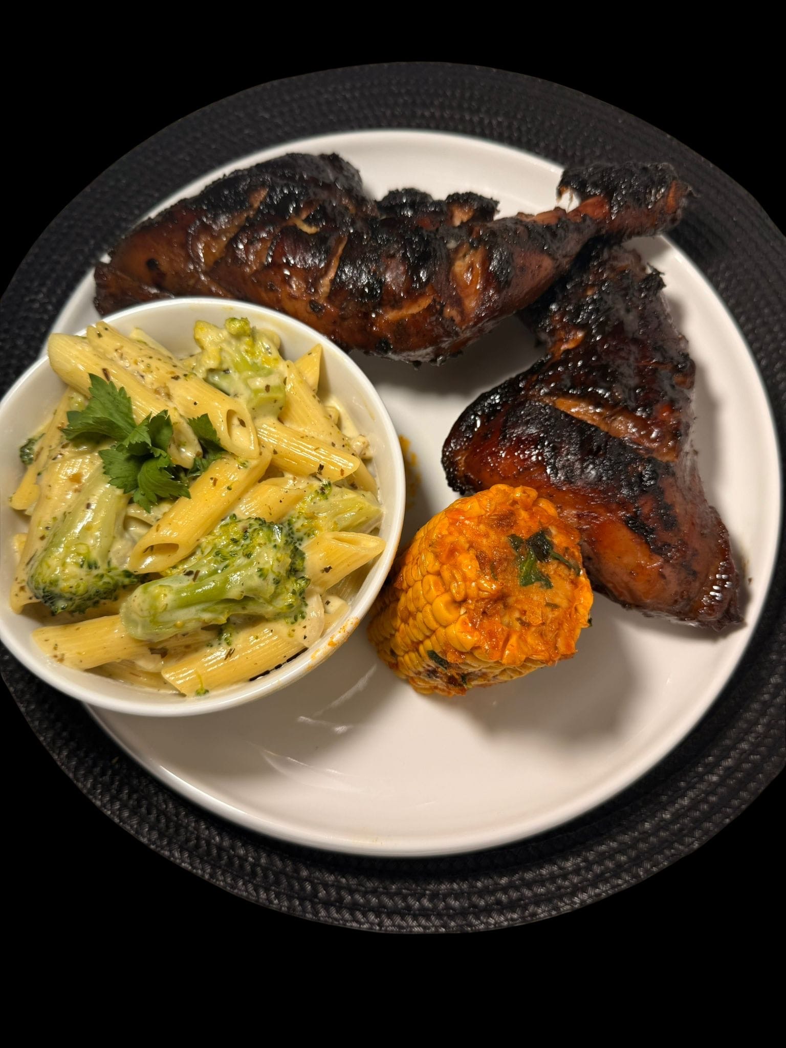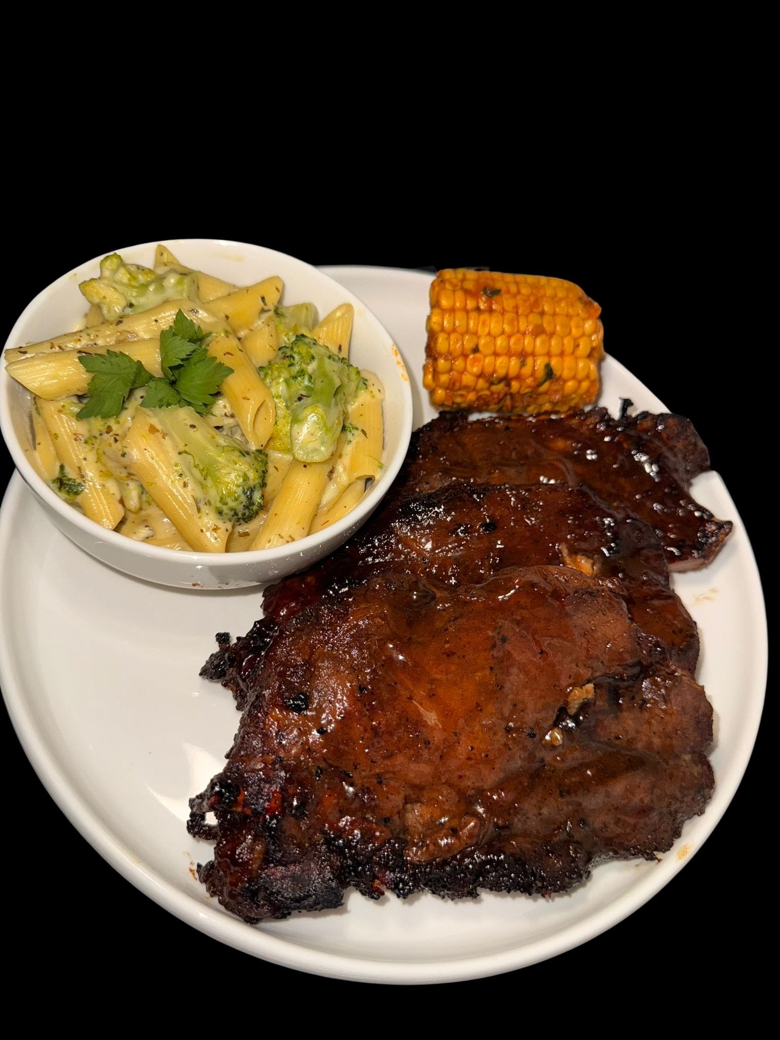 BBQ Carbonade: met koolsalade, halve maïskolf, knoflookbrood, bijgerecht en drank